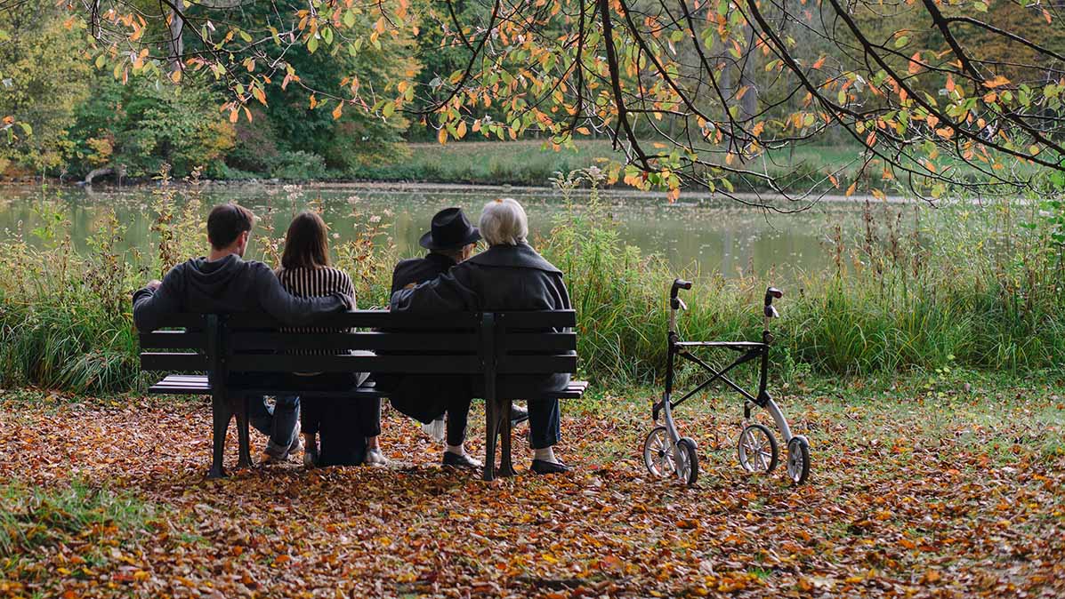 Ein junges und ein älteres Paar sitzen nebeneinander auf einer Bank an einem See in einer herbstlichen Landschaft.