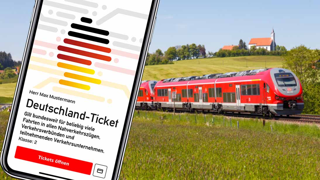Eine Regionalbahn fährt durch die Landschaft. Davor ein Handy mit Deutschlandticket.
