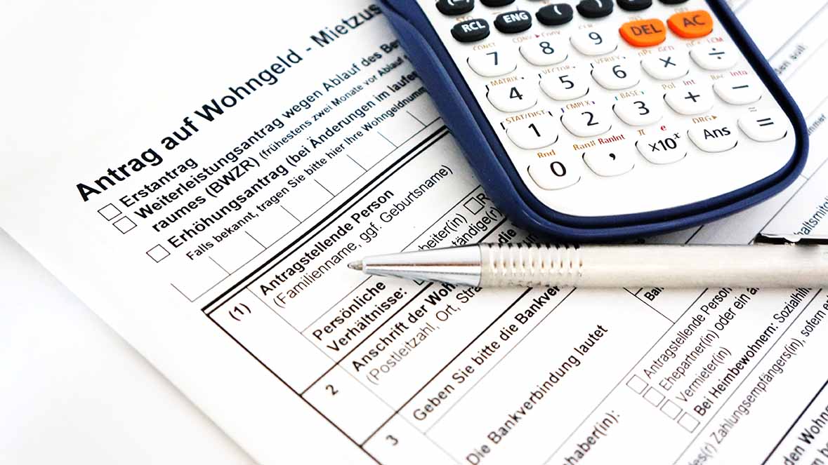 Ein Antrag für Wohngeld, auf dem ein Kugelschreiber liegt. Daneben ein Taschenrechner.
